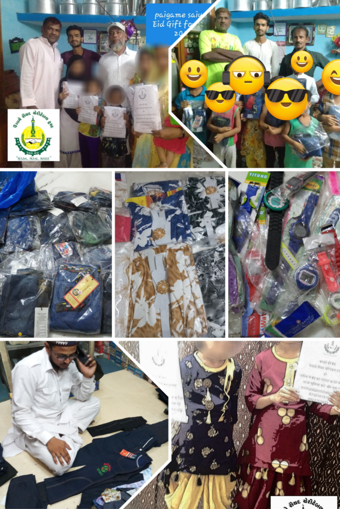 પૈગામે સૈયદ ચેરિટેબલ ટ્રસ્ટ દર વર્ષે એક સુંદર પહેલ કરે છે – ગરીબ અને જરૂરતમંદ પરિવારોના નાનકડા બાળકો માટે ઈદના નવા કપડા આપે છે. કારણ કે ઈદ બાળકો માટે ખુશીનું તહેવાર છે. જયારે એ નાનાં ચહેરાઓ પર એક ઝગમગતી સ્માઈલ જોઈ લો, તો તેના સમક્ષ બીજી કોઈ પણ ખુશીની વસ્તુ ન હોય. અલ્લાહે જેમને અઢળક આપ્યું છે એમના બાળકો ઈદ માં દરેક જીદ પોતાના વાલીઓ જોડે પૂરી કરાવે છે. પણ જેમના જોડે નથી એમની ઈદ કેવી હોય છે ? આ એહસાસ પણ કરવું જરૂરી છે.