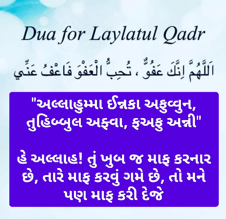 اللَّهُمَّ إِنَّكَ عَفُوٌّ تُحِبُّ الْعَفْوَ فَاعْفُ عَنِّي “અલ્લાહુમ્મા ઈન્નકા અફુવ્વુન, તુહિબ્બુલ અફ્વા, ફઅફુ અન્ની” (હે અલ્લાહ! તું ખુબ જ માફ કરનાર છે, તારે માફ કરવું ગમે છે, તો મને પણ માફ કરી દેજે.)