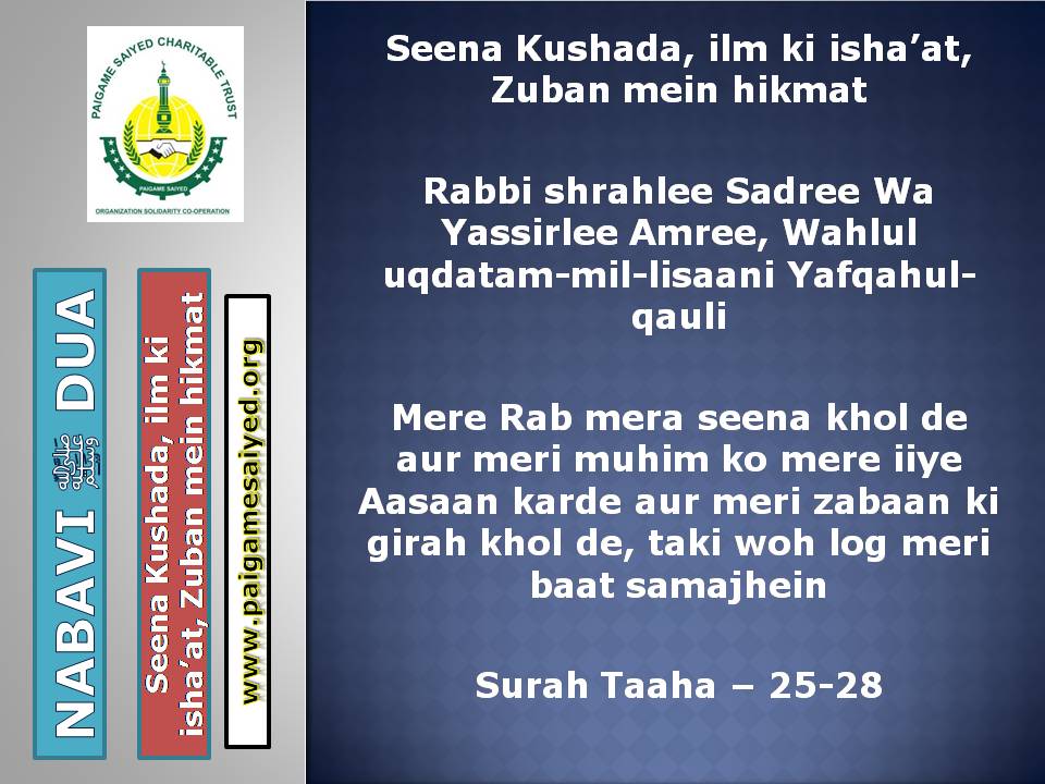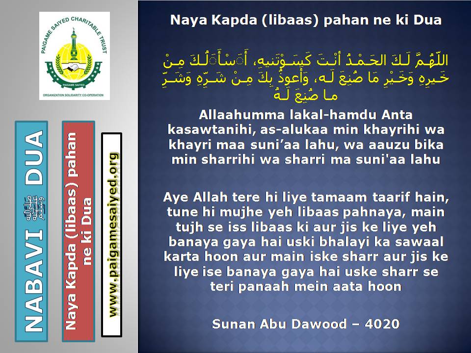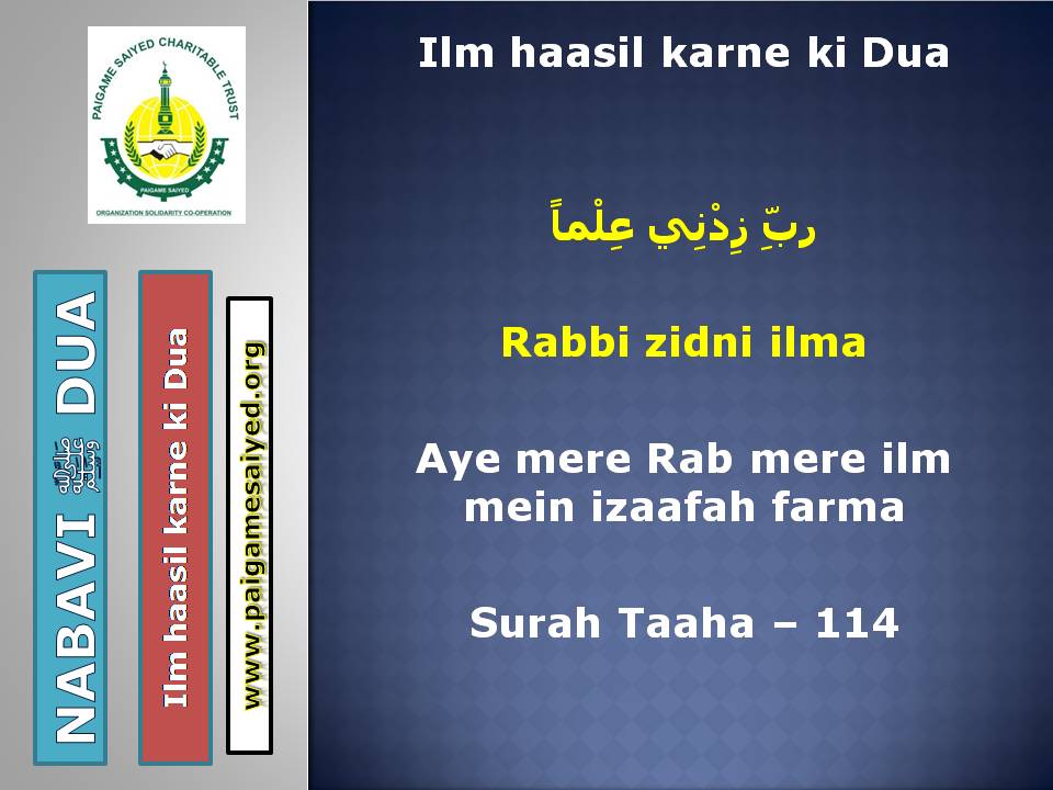 Ilm hasil karne ki DuaIlm hasil karne ki DuaApni Aulad ke liye ye Dua karein taki galat raston par na bhatkeNaya Libas (cloth) pahane waqt ki DuaKapda Pahan ne wale ke liye DuaShirk se bachne ki DuaNafa Bakhsh ilm, Pakiza Rizq, Makbul Amal ki DuaGhar se baahar nikalte waqt ki Dua