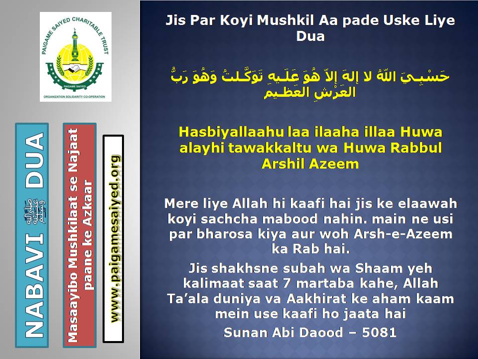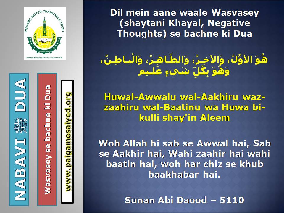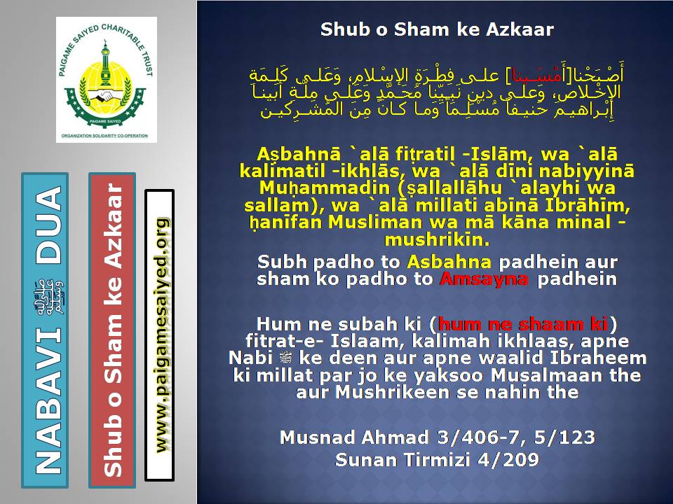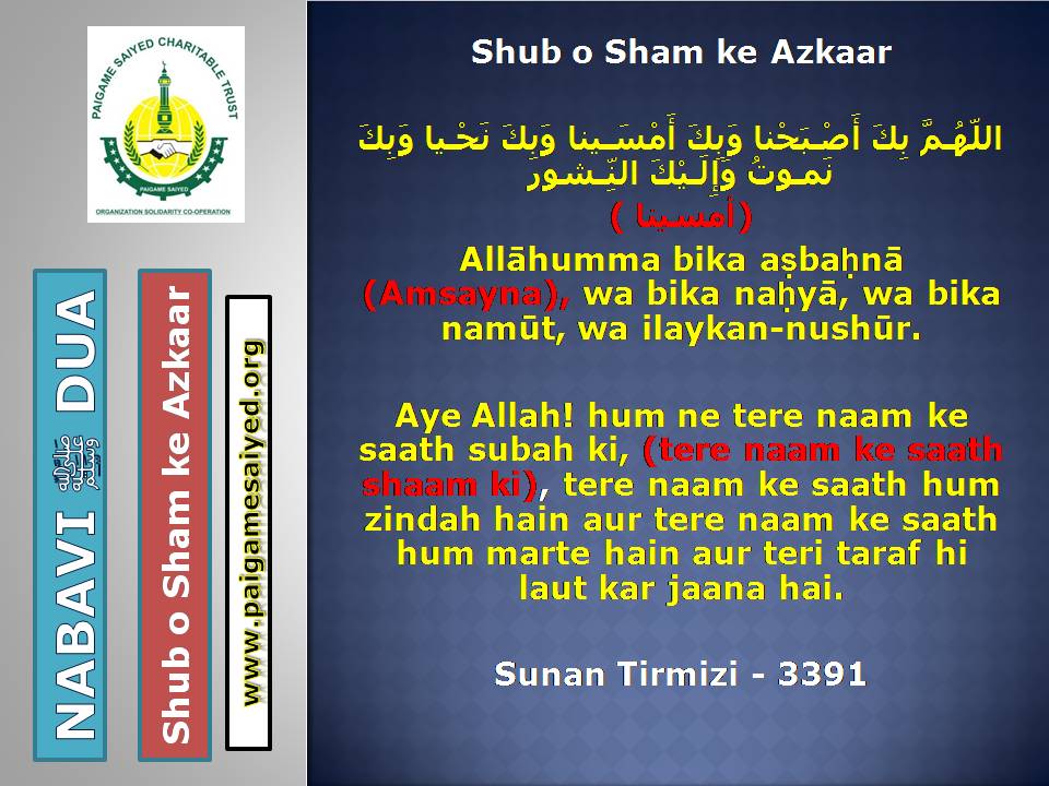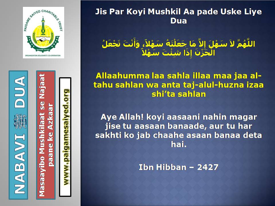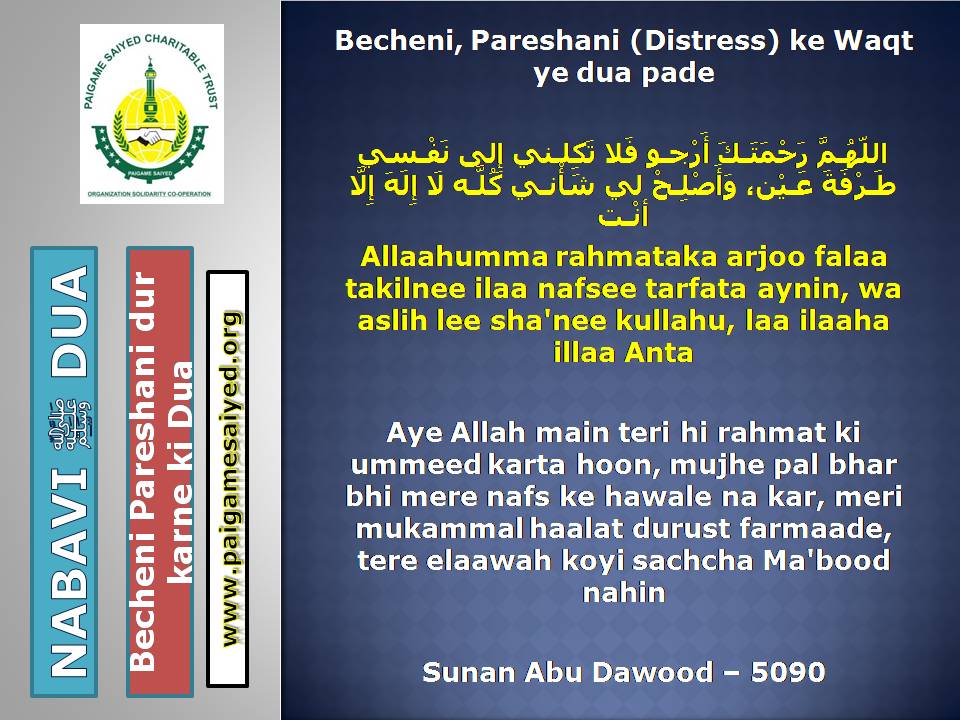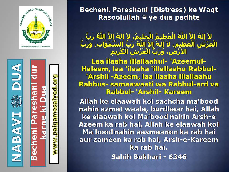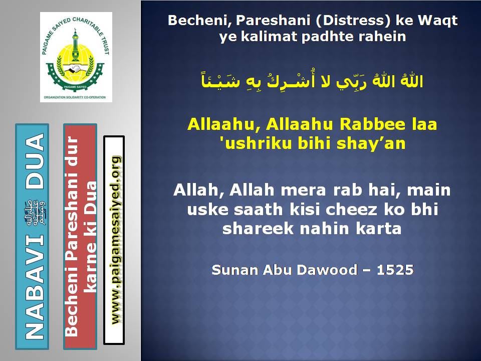 (Dua for Worry, Stress, Anxiety, Grief, Incapacity, Laziness, Cowardice, Miserliness, Debt)Innā lillāhi wa innā ilayhi rāji‘ūn. Allāhumma ajirnī fī muṣībatī wa-khluf lī khayran minhā. – Jisko Musibat pohche wo yeh Dua parheBaitul-Khala (Washroom, Toilet) me dakhil hone ki, Nikalne ki DuaBecheni, Pareshani (Distress) dur karne ke liye ye Dua parheGussey (Anger) ke waqt Aauzo parheAstaghfar aur TaubaBecheni, Pareshani, Buri Nafsani khwahish se bachne ke liye ye Dua parheBecheni Pareshani (Confusion) ke Waqt is kalimat ka wird karePareshan haal sakhsh ye Dua padh kar jo bhi Dua mangega woh Qabool hogiKhaane Peene ke Waqt ki DuaKhana Khane ke Baad ki DuaeinKhana khilane wale ke liye Dua (Jiske waha Dawat ho ya koi Khana khilaye)Bura Khwab (Bad Dream) dekhe to kya kare?Sawaari (Vehicles, Bus, Train, Flight) par Sawaar hone ki DuaMusafir Ko Rukhsat karte Waqt ki Dua Safar ke Dauran ya Manzil par Rukne (Halt) karein to ye Dua parheMusafir (traveller) Ki Muqeem (resident) Ke Liye DuaSafar se Wapasi ki DuaSubho Sham ke AzkaarAllah Rabbul izzat ko har waqt yad karte raho uske shukra Guzar rahoAllah Rabbul izzat ko Rat Din yad karte raho wahi hamari sun ne wala haiSubho Sham ke AzkaarAllah taala ka zikr karne wale ki MisalSubho Sham ke AzkaarSabse behtar Amal – ZikrullahSubho Sham ke AzkaarAllah taala ke zikr se zuban ko tar rakhoSayyadul Astaghfar