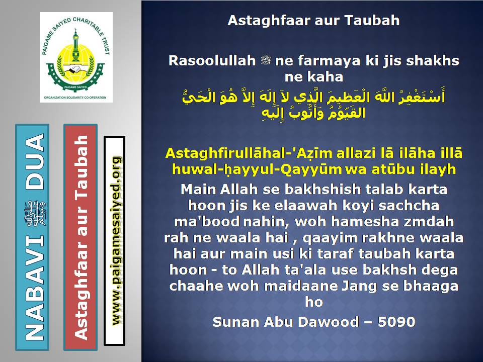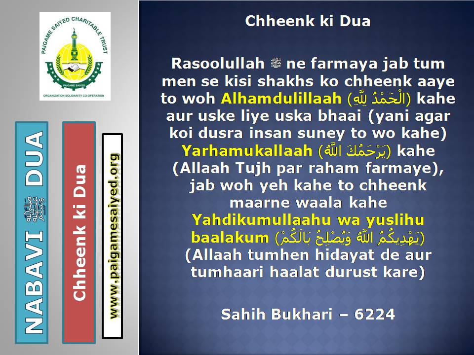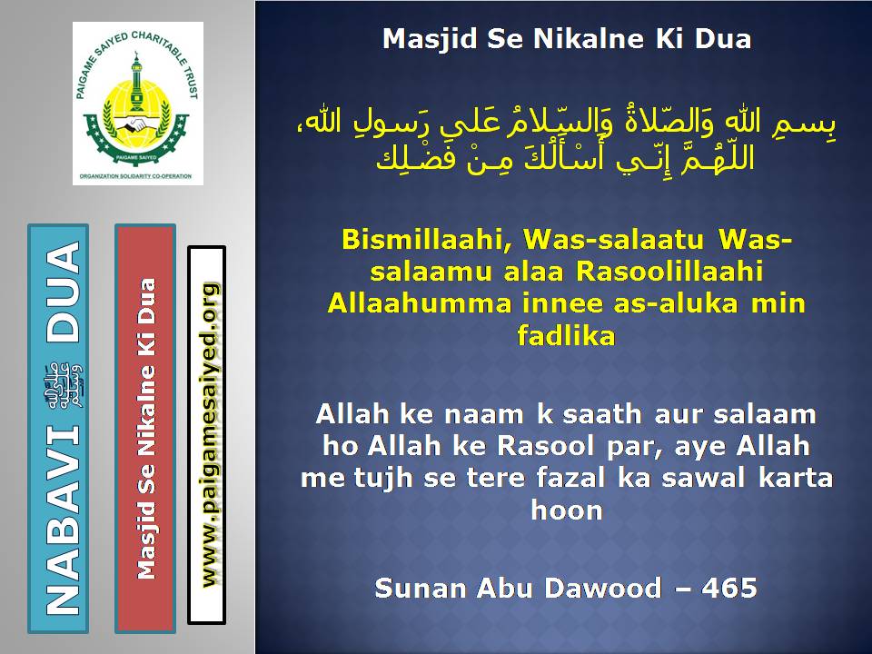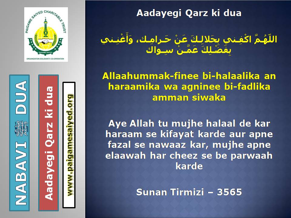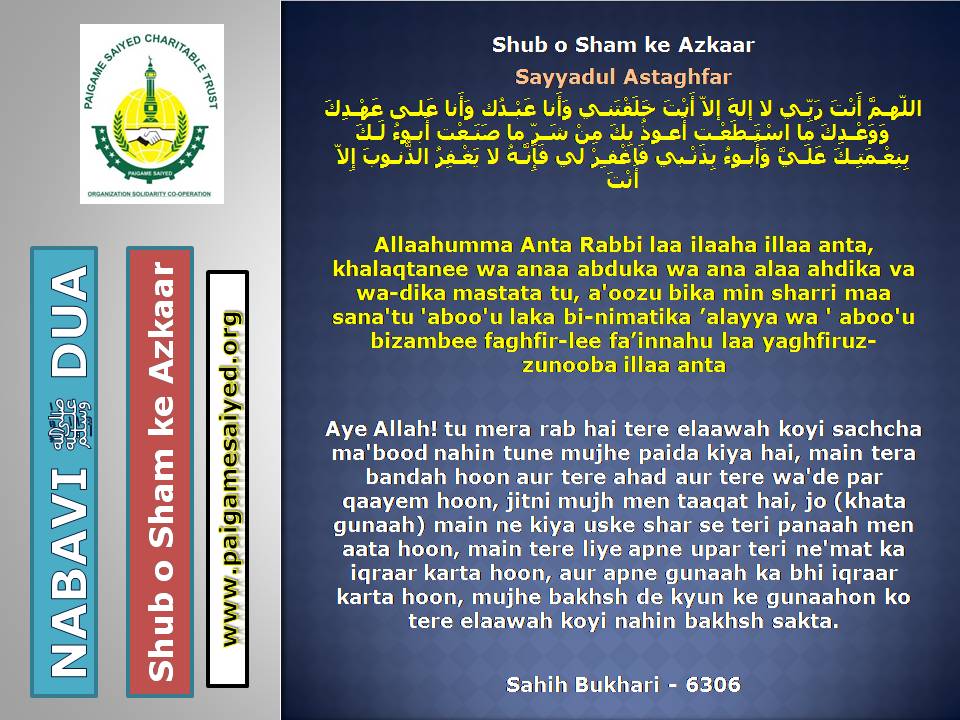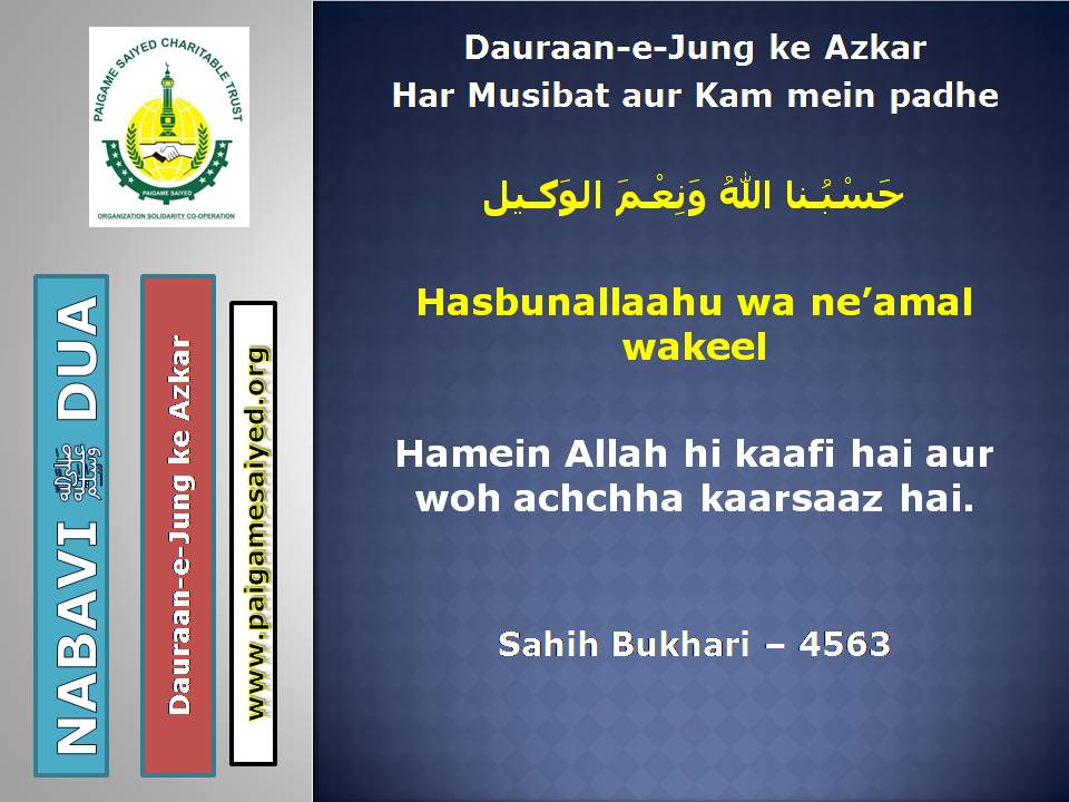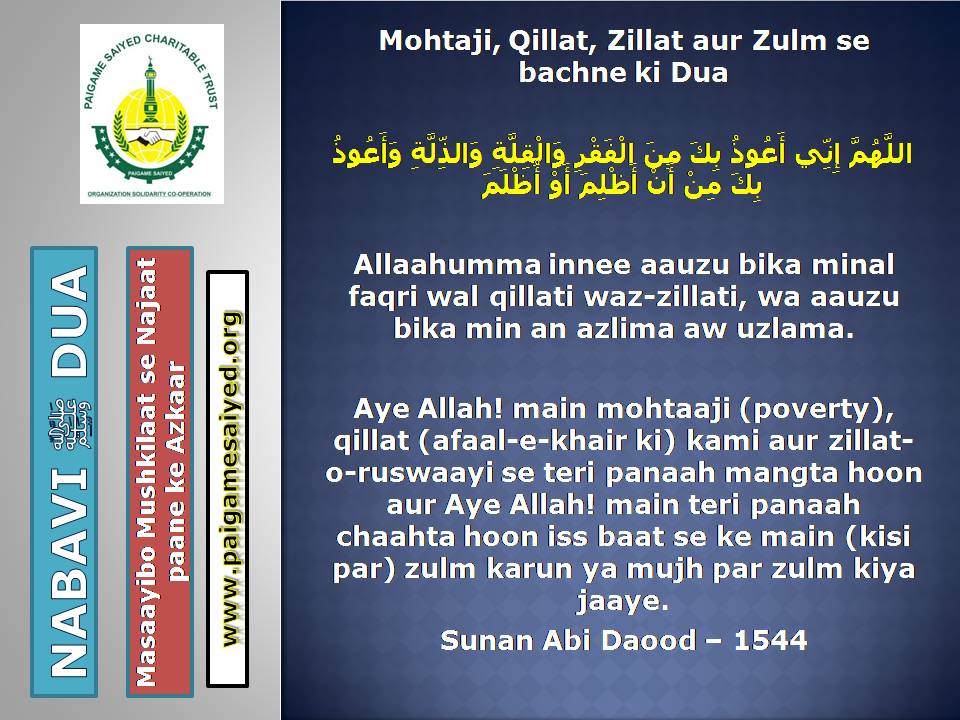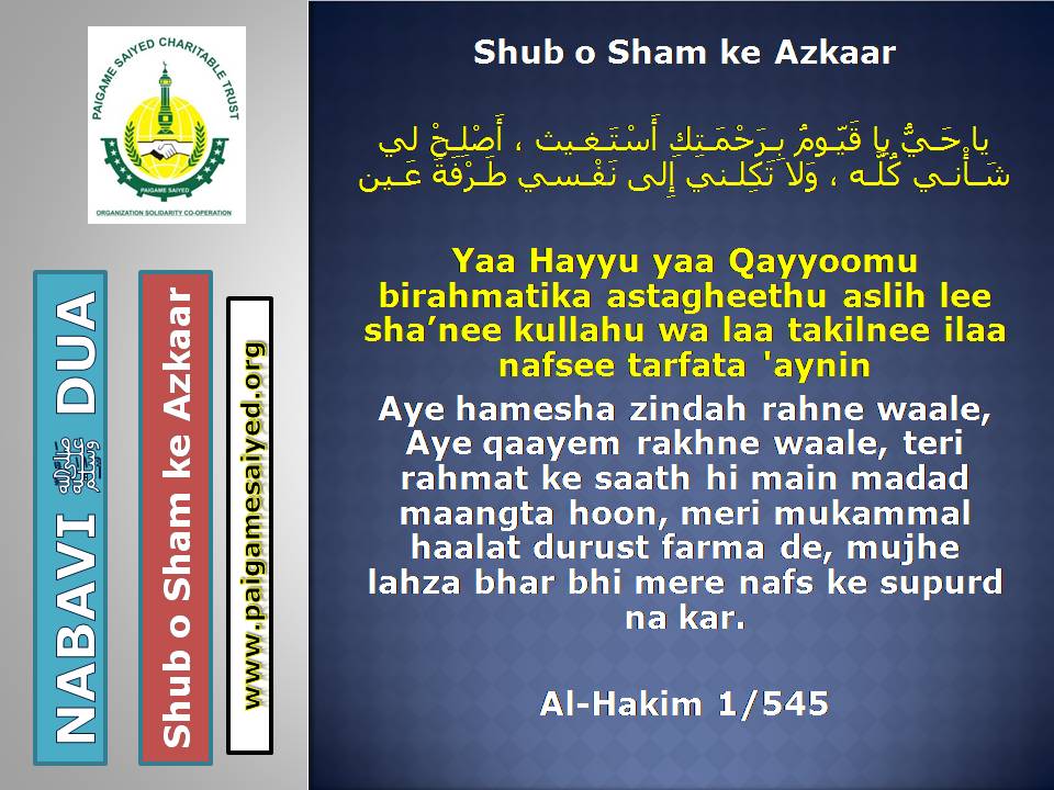 (Dua for Worry, Stress, Anxiety, Grief, Incapacity, Laziness, Cowardice, Miserliness, Debt)Innā lillāhi wa innā ilayhi rāji‘ūn. Allāhumma ajirnī fī muṣībatī wa-khluf lī khayran minhā. – Jisko Musibat pohche wo yeh Dua parheBaitul-Khala (Washroom, Toilet) me dakhil hone ki, Nikalne ki DuaBecheni, Pareshani (Distress) dur karne ke liye ye Dua parheGussey (Anger) ke waqt Aauzo parheAstaghfar aur TaubaBecheni, Pareshani, Buri Nafsani khwahish se bachne ke liye ye Dua parheBecheni Pareshani (Confusion) ke Waqt is kalimat ka wird karePareshan haal sakhsh ye Dua padh kar jo bhi Dua mangega woh Qabool hogiKhaane Peene ke Waqt ki DuaKhana Khane ke Baad ki DuaeinKhana khilane wale ke liye Dua (Jiske waha Dawat ho ya koi Khana khilaye)Bura Khwab (Bad Dream) dekhe to kya kare?Sawaari (Vehicles, Bus, Train, Flight) par Sawaar hone ki DuaMusafir Ko Rukhsat karte Waqt ki Dua Safar ke Dauran ya Manzil par Rukne (Halt) karein to ye Dua parheMusafir (traveller) Ki Muqeem (resident) Ke Liye DuaSafar se Wapasi ki DuaSubho Sham ke AzkaarAllah Rabbul izzat ko har waqt yad karte raho uske shukra Guzar rahoAllah Rabbul izzat ko Rat Din yad karte raho wahi hamari sun ne wala haiSubho Sham ke AzkaarAllah taala ka zikr karne wale ki MisalSubho Sham ke AzkaarSabse behtar Amal – ZikrullahSubho Sham ke AzkaarAllah taala ke zikr se zuban ko tar rakhoSayyadul Astaghfar