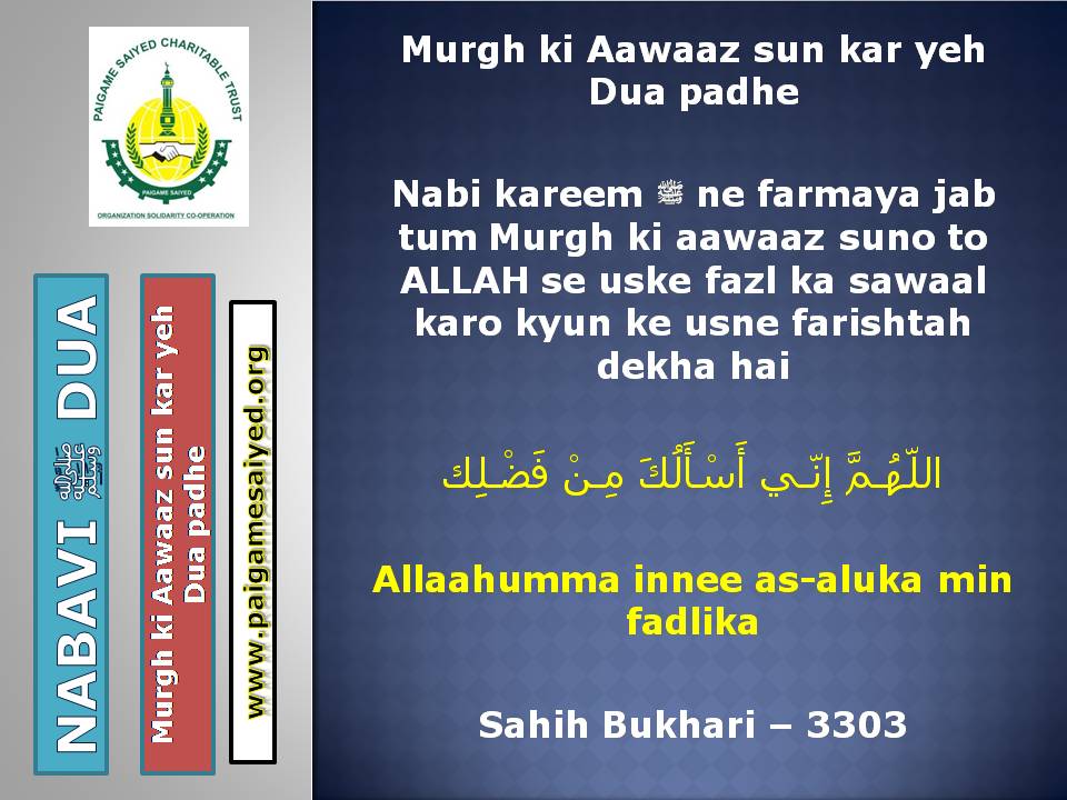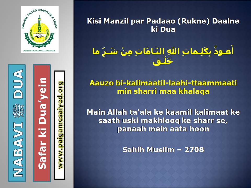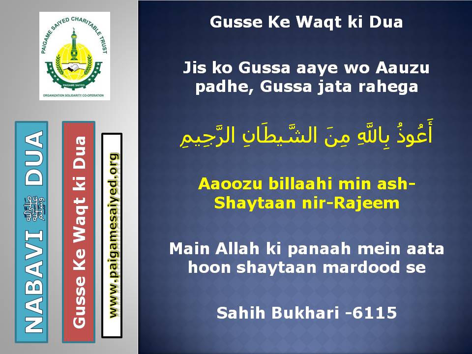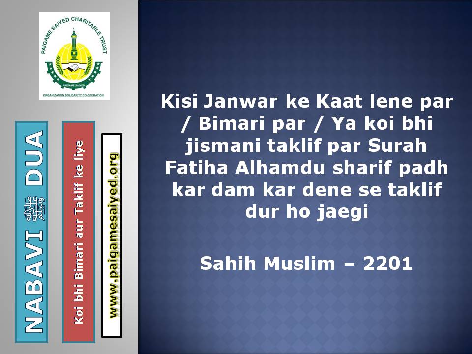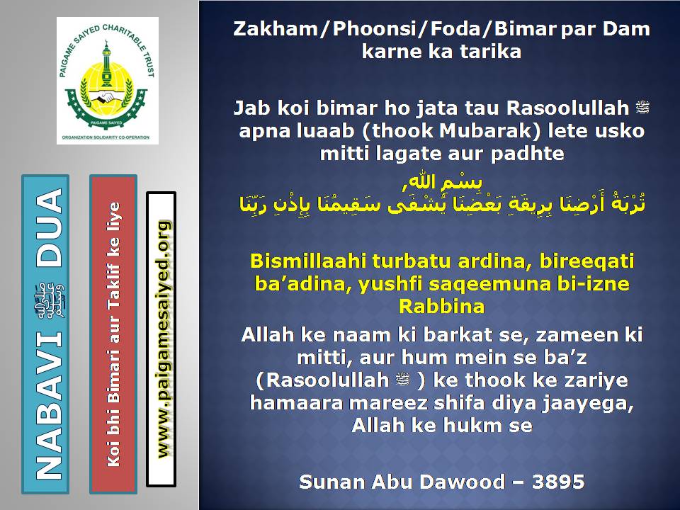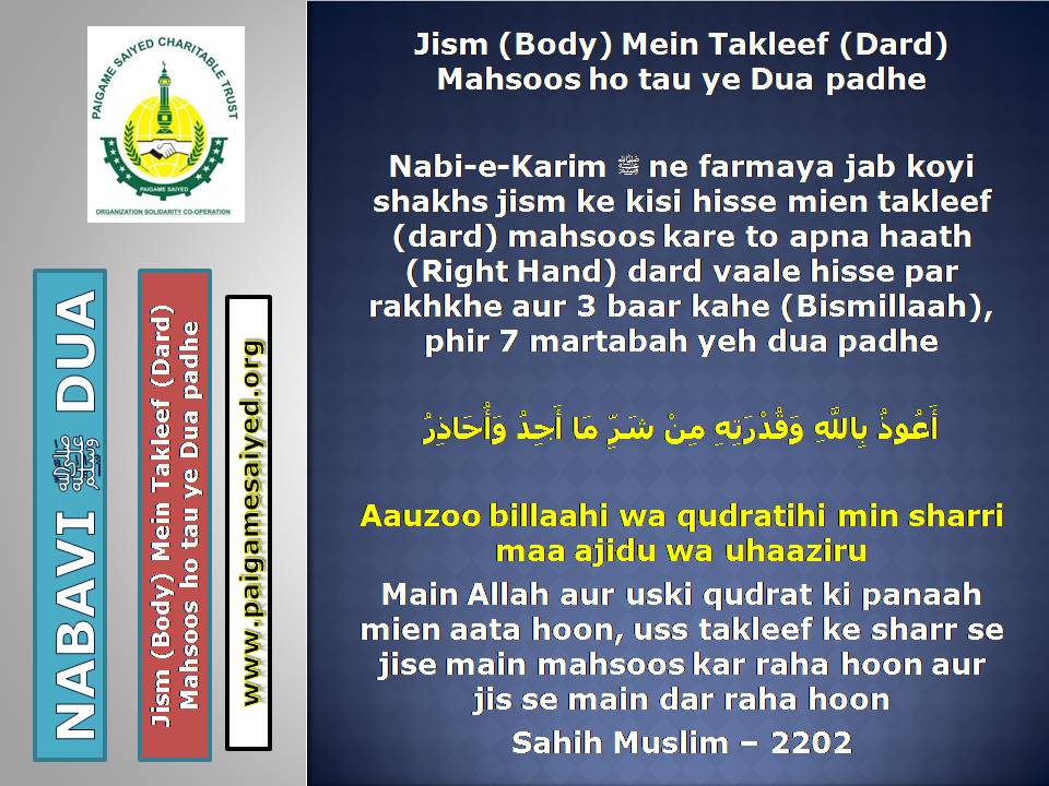 Masjid se Nikal ne ki DuaChand dekh kar parhne ki DuaTohfa len den ke waqt ya kisi bhi Mauqe par Barkat ke liye Dua kareinGadhe ya Kutte ki Awaaz suno to Aaoozu parhoJab Murgh ki Awaaz sunoShadi karne wala (Apni biwi ke peshani ke baal pakad kar), Sawari (Aajkal ke liye Vehicles) Kharidne wala, Khadima (Ajkal ke Gharelu Nokar) khardine wala ye Dua parheDulha Dulhan Ko Mubarak bad dene ki DuaKisi Mariz (Patient) ko dekhne jaye to ye Dua parheJab Chheenk aaye tab ye kalimat kaheKoi bhi Zakham, Phoonsi, Foda, Bimar par Dam karne ka tarika3 Martaba Surah Fatiha parh kar dam kar ne ka AmalJism (Body) Mein Takleef (Dard) Mehsoos ho tau ye Dua parheJis se Qarz liye jaye uske liye ye Dua kareinQarz ki adaayegi ke liye DuaHar kam, Musibat, Paresani aur daurae jung mein iska zikr kareinSarkash Shayatin, Bure asraat wagerah, Bure Jhaad phoonk dam se bahne ki DuaBure Khayal, Shaitani Wasvasey, Negative Thought se bachne ki DuaMohtaji, Qillat, Zillat, Zulm se bachne ki DuaJis par koi musibat pareshani aa pade woh he Dua parheAham mamlat (Important work) mein ya koi bhi pareshani mein ye Dua parheGham, Fikar, Aajazi, Susti, Buzdili, Bukhl, Karz se bachne ki Dua