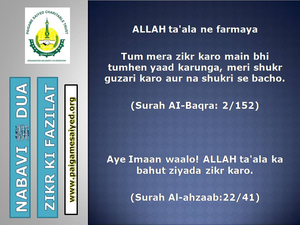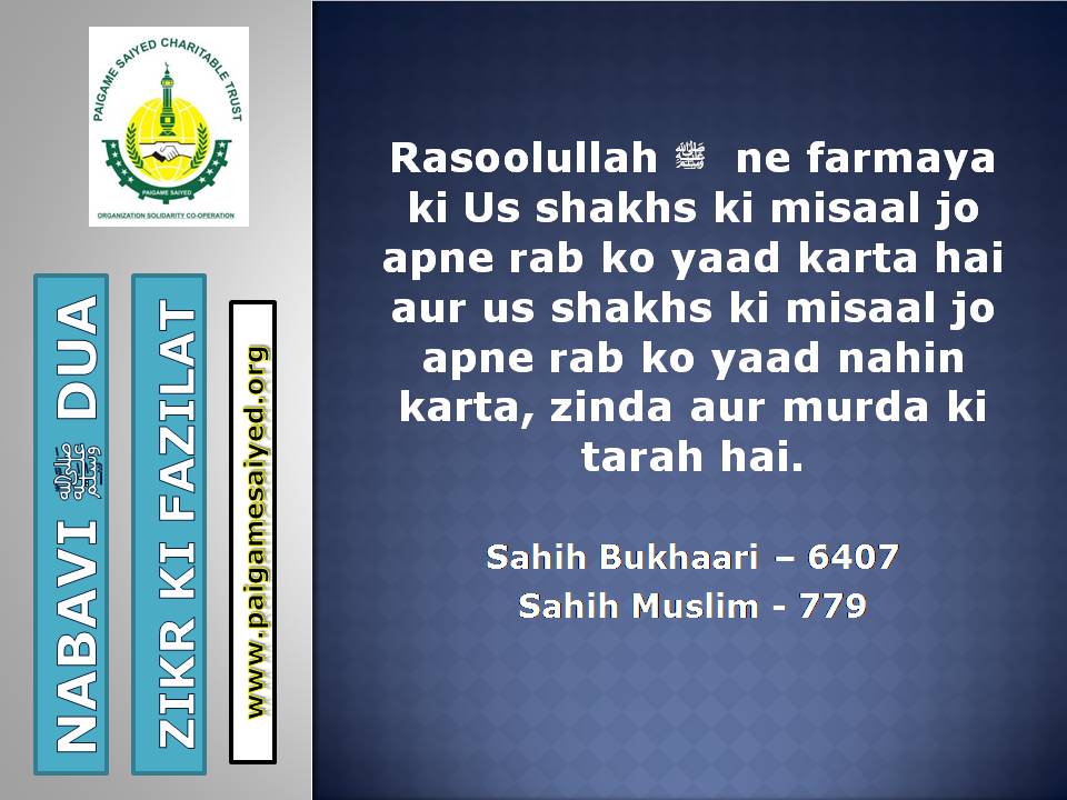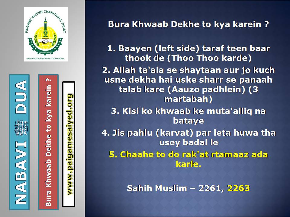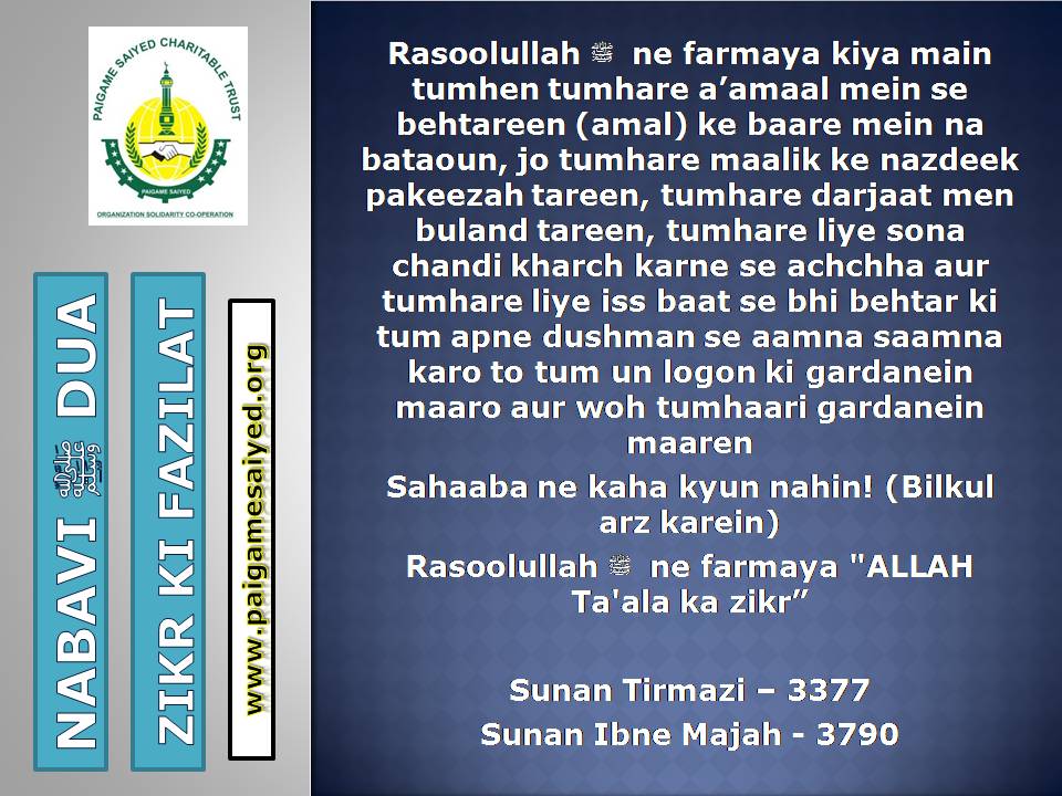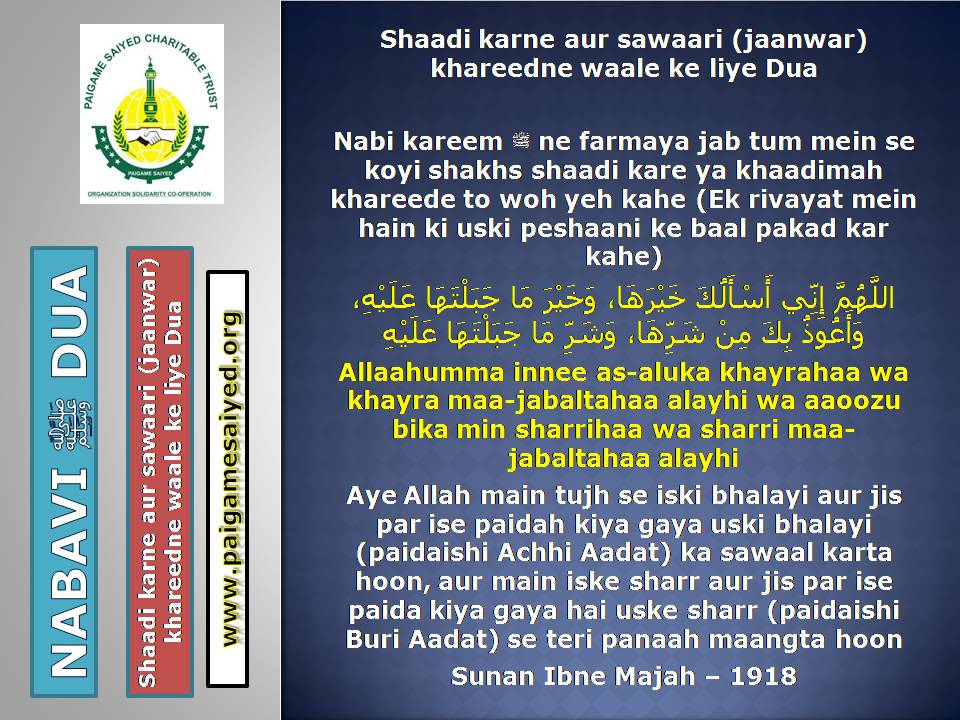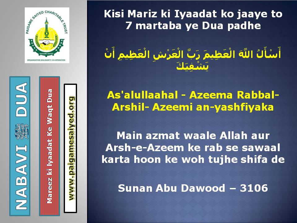 Masjid se Nikal ne ki DuaChand dekh kar parhne ki DuaTohfa len den ke waqt ya kisi bhi Mauqe par Barkat ke liye Dua kareinGadhe ya Kutte ki Awaaz suno to Aaoozu parhoJab Murgh ki Awaaz sunoShadi karne wala (Apni biwi ke peshani ke baal pakad kar), Sawari (Aajkal ke liye Vehicles) Kharidne wala, Khadima (Ajkal ke Gharelu Nokar) khardine wala ye Dua parheDulha Dulhan Ko Mubarak bad dene ki DuaKisi Mariz (Patient) ko dekhne jaye to ye Dua parheJab Chheenk aaye tab ye kalimat kaheKoi bhi Zakham, Phoonsi, Foda, Bimar par Dam karne ka tarika3 Martaba Surah Fatiha parh kar dam kar ne ka AmalJism (Body) Mein Takleef (Dard) Mehsoos ho tau ye Dua parheJis se Qarz liye jaye uske liye ye Dua kareinQarz ki adaayegi ke liye DuaHar kam, Musibat, Paresani aur daurae jung mein iska zikr kareinSarkash Shayatin, Bure asraat wagerah, Bure Jhaad phoonk dam se bahne ki DuaBure Khayal, Shaitani Wasvasey, Negative Thought se bachne ki DuaMohtaji, Qillat, Zillat, Zulm se bachne ki DuaJis par koi musibat pareshani aa pade woh he Dua parheAham mamlat (Important work) mein ya koi bhi pareshani mein ye Dua parheGham, Fikar, Aajazi, Susti, Buzdili, Bukhl, Karz se bachne ki Dua