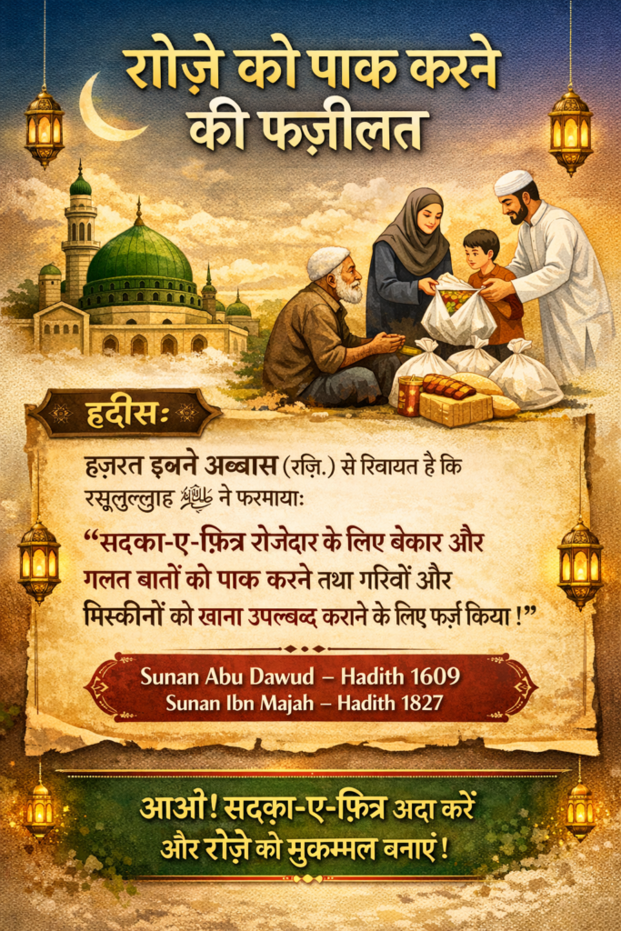 1️⃣ सदक़ा-ए-फ़ित्र फ़र्ज़ होने की हदीस हदीस: हज़रत अब्दुल्लाह बिन उमर (रज़ि.) से रिवायत है कि रसूलुल्लाह ﷺ ने रमज़ान के आखिर में सदक़ा-ए-फ़ित्र एक सा‘ खजूर या एक सा‘ जौ हर मुसलमान पर फ़र्ज़ किया, चाहे वह गुलाम हो या आज़ाद, मर्द हो या औरत, छोटा हो या बड़ा। Reference: Sahih al-Bukhari – Hadith 1503 Sahih Muslim – Hadith 984 2️⃣ रोज़े को पाक करने की फ़ज़ीलत हदीस: हज़रत इब्ने अब्बास (रज़ि.) से रिवायत है कि रसूलुल्लाह ﷺ ने सदक़ा-ए-फ़ित्र को रोज़ेदार के लिए बेकार और गलत बातों से पाक करने तथा गरीबों और मिस्कीनों को खाना उपलब्ध कराने के लिए फ़र्ज़ किया। Reference: Sunan Abu Dawud – Hadith 1609 Sunan Ibn Majah – Hadith 1827 3️⃣ ईद की नमाज़ से पहले अदा करने की हिदायत हदीस: रसूलुल्लाह ﷺ ने हुक्म दिया कि सदक़ा-ए-फ़ित्र लोगों के ईद की नमाज़ के लिए निकलने से पहले अदा कर दिया जाए। Reference: Sahih al-Bukhari – Hadith 1509 4️⃣ फ़ित्र की मात्रा (एक सा‘) की हदीस हदीस: हज़रत अबू सईद ख़ुदरी (रज़ि.) फ़रमाते हैं कि हम रसूलुल्लाह ﷺ के ज़माने में सदक़ा-ए-फ़ित्र एक सा‘ खाने की चीज़ से अदा करते थे, जैसे जौ, किशमिश, पनीर या खजूर। Reference: Sahih al-Bukhari – Hadith 1510 Sahih Muslim – Hadith 985 5️⃣ हर मुसलमान पर फ़ित्र वाजिब हदीस: हज़रत अब्दुल्लाह बिन उमर (रज़ि.) बयान करते हैं कि रसूलुल्लाह ﷺ ने सदक़ा-ए-फ़ित्र एक सा‘ खजूर या एक सा‘ जौ हर मुसलमान पर वाजिब किया चाहे वह आज़ाद हो या गुलाम, मर्द हो या औरत, छोटा हो या बड़ा। Reference: Sunan al-Tirmidhi – Hadith 676 6️⃣ नमाज़-ए-ईद से पहले देने की फ़ज़ीलत हदीस: जिसने सदक़ा-ए-फ़ित्र ईद की नमाज़ से पहले अदा किया, तो वह क़बूल किया हुआ सदक़ा है; और जिसने नमाज़ के बाद दिया, तो वह आम सदक़ों में से एक सदक़ा है। Reference: Sunan Abu Dawud – Hadith 1611 Sunan Ibn Majah – Hadith 1827 7️⃣ सहाबा का अमल हदीस: हज़रत अब्दुल्लाह बिन उमर (रज़ि.) फ़रमाते हैं कि सहाबा-ए-किराम ईद-उल-फ़ित्र से एक या दो दिन पहले सदक़ा-ए-फ़ित्र अदा कर दिया करते थे। Reference: Sahih al-Bukhari – Hadith 1511 8️⃣ ग़रीबों को ईद के दिन बे-नियाज़ करना हदीस: रसूलुल्लाह ﷺ ने फ़रमाया: “ईद के दिन गरीबों को इतना दे दो कि वह लोगों से मांगने से बे-नियाज़ हो जाएं।” Reference: Sunan al-Daraqutni – Hadith 2067